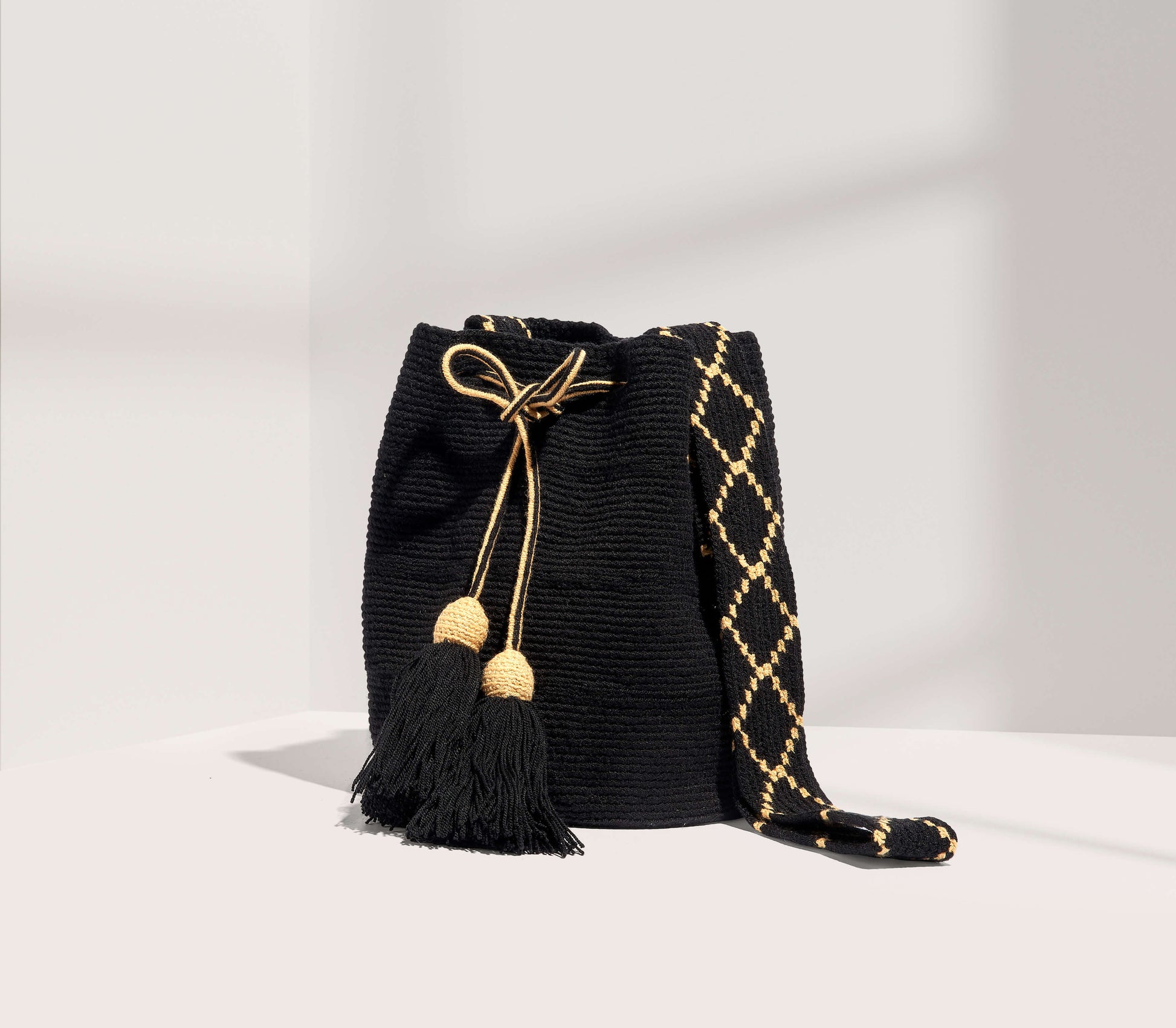 Crocheted cross-body bags made by Indigenous Wayúu artisans from La Guajira, Colombia.
